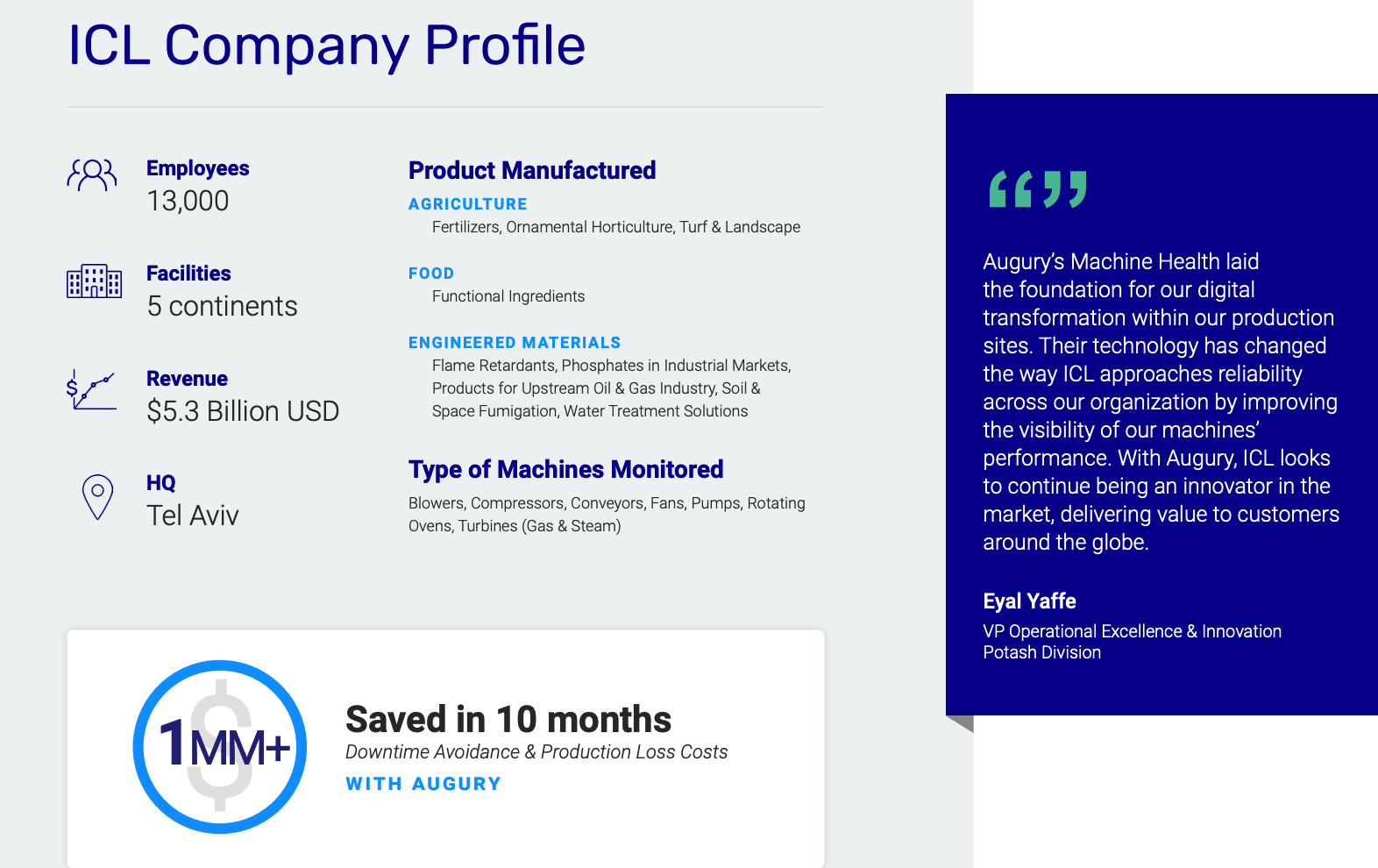 Download our Case Study to learn how ICL, a leader in unique materials, mitigated $1MM+ in avoided downtime costs, machine repairs, and production loss within the first 10 months